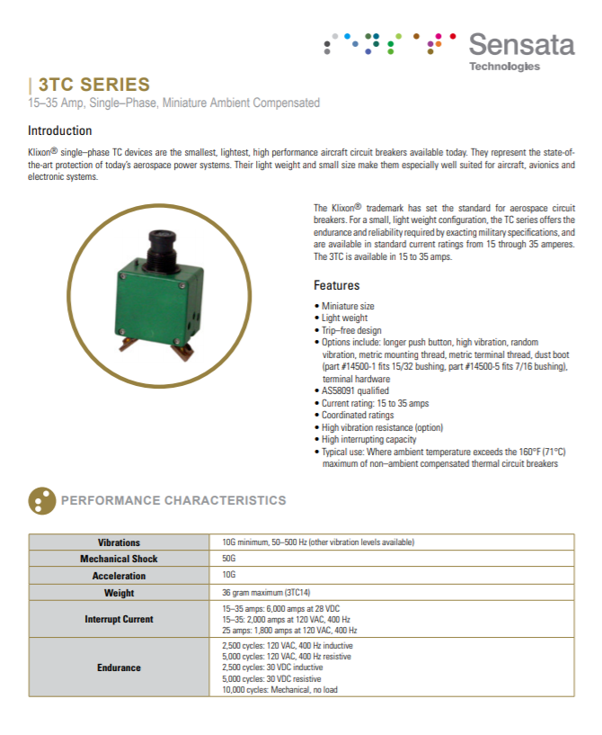Klixon?商標(biāo)為航空航天電路設(shè)定了標(biāo)準(zhǔn)斷路器。對于小而輕的配置,TC系列提供